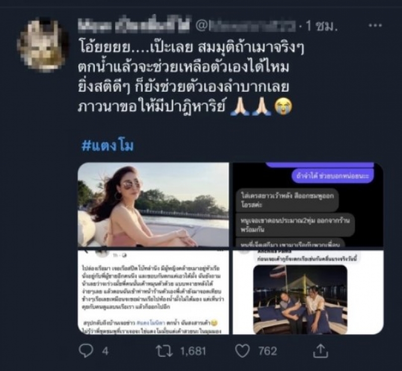 เเละในเวลาต่อมา นักเเสดงดังอย่าง บีม ศรัณยู ประชากริช นั้นก็ไม่อยู่เฉย ช่วยลงเรือออกช่วยตามหา แตงโม นิดา เเละในขณะที่ด้านของอินสตราเเกรมของ แตงโม นิดา ก็ได้มีเหล่าคนในแวดวงการบันเทิงเข้ามาร่วมคอมเมนต์ภาวนาถึง แตงโม นิดา ขอให้ปลอกภัยอย่างมากมาย