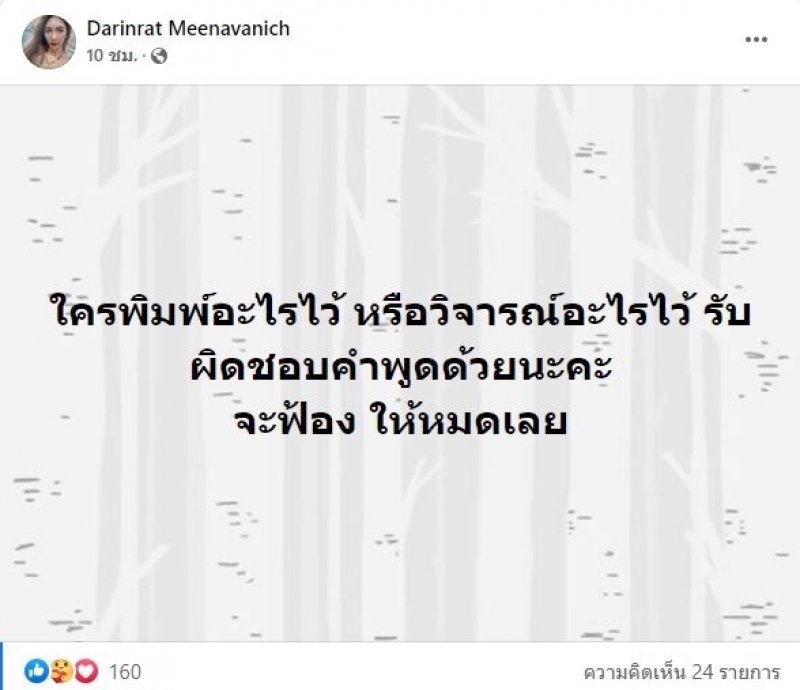 ล่าสุดเมื่อวันที่ 26 ก.พ.2565 เบนซ์ พริกไทย หรือ เบนซ์ ดริณทร์รัฏ มีนะวาณิชย์ นักร้องสาวและเป็นภรรยาของ ไฮโซปอ ตนุภัทร เลิศทวีวิทย์ ได้โพสต์ข้อความผ่านเฟซบุ๊กระบุว่า ใครพิมพ์อะไรไว้ หรือวิจารณ์อะไรไว้ รับผิดชอบคำพูดด้วยนะคะ จะฟ้อง ให้หมดเลย