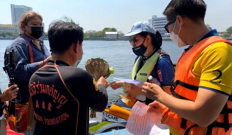 จากนั้น ทีมกู้ภัยฯ ได้พบกับ เต้ มงคลกิตติ์ จึงฝากทำพิธีดังกล่าว โดยให้นักแสดงสาวนั่งเรือไปทำพิธีดังกล่าวบริเวณกลางแม่น้ำเจ้าพระยา ห่างจากหน้าโป๊ะเรือที่เจ้าหน้าที่ประมาณ 50 เมตร โดย ณ ตอนนั้นทีมกู้ภัยฯ เชื่อว่า เป็นพิธีที่ไม่ได้เสียหายอะไร และก็ทำเพราะเขาได้ตั้งใจนำมาให้อีกด้วย ต่อมาก็ได้พบว่าแตงโม ลอยน้ำมาให้เห็น
