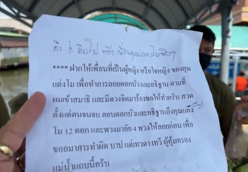 จากกรณีที่เมื่อเวลา 12.07 น. เฟซบุ๊ก NAKON45 อัญวุฒิ โพธิ์อำไพ ซึ่งเป็นเจ้าหน้าที่กู้ภัยฯ ทีมค้นหา แตงโม นิดา ได้พบจดหมายปริศนาพร้อมดอกบัว โดยเขียนระบุข้อความว่า "ฝากให้เพื่อนที่เป็นผู้หญิงหรือใจหญิงของคุณแตงโม เพื่อทำการลอยดอกบัว และอธิษฐานตามที่ผมเข้าสมาธิ และมีดวงจิตมาร้องขอให้ทำครับ สวดตั้งแต่ต้นจนจบ ลอยดอกบัวและอธิษฐานถึงคุณแตงโม 12 ดอก และพวงมาลัย 4 พวงให้ลอยก่อน เพื่อขอขมาการทำผิด บาป แด่เทวดาเทวี ผู้คุ้มครองแม่น้ำแทบนี้ครับ"