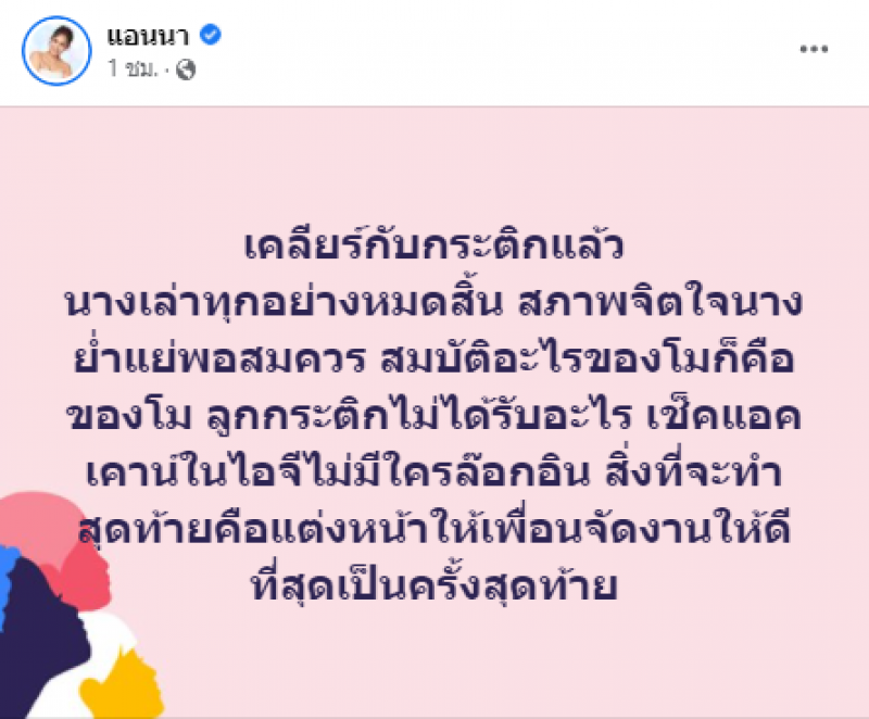 สิ่งที่จะทำสุดท้ายคือแต่งหน้าให้เพื่อน จัดงานให้ดีที่สุดเป็นครั้งสุดท้าย โดยระบุด้วยว่า คุยกันยาวมาก ถามทุกข้อสงสัยหมดแล้ว ที่เหลือให้ตำรวจกับผลทางการนิติวิทยา ถ้าตรงกันก็จบ ส่งเพื่อนไปในที่ ๆ ดี