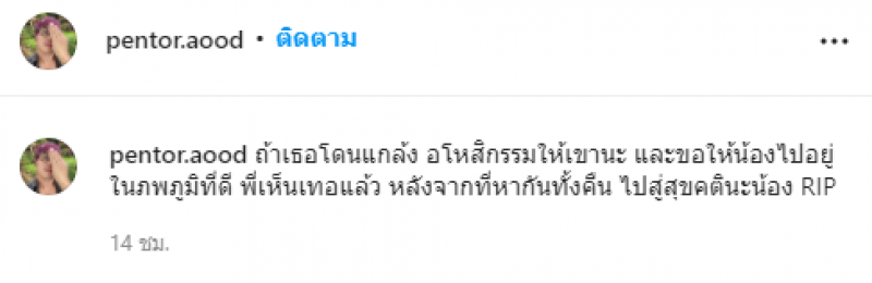 ล่าสุด อู๊ด เป็นต่อ ได้โพสต์ภาพของหนุ่ม โตโน่ อดีตคนรักของดาราดังผู้จากไป ที่อยู่บนเรือเพื่อร่วมค้นหา แตงโม ด้วยใบหน้าดูเศร้า พร้อมระบุข้อความถึงการจากไปของ แตงโม เอาไว้ด้วยว่า ถ้าเธอโดนแกล้ง ก็ให้อภัยเขานะ และขอให้น้องไปอยู่ในภพภูมิที่ดี พี่เห็นเทอแล้ว หลังจากที่หากันทั้งคืน ไปสู่ในที่ที่ดีนะน้อง RIP
