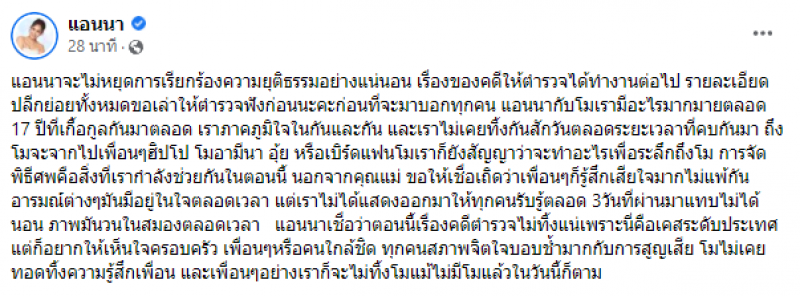 แต่เราไม่ได้แสดงออกมาให้ทุกคนรับรู้ตลอด 3 วันที่ผ่านมาแทบไม่ได้นอน ภาพมันวนในสมองตลอดเวลา แอนนาเชื่อว่าตอนนี้เรื่องคดี ตำรวจไม่ทิ้งแน่เพราะนี่คือเคสระดับประเทศ แต่ก็อยากให้เห็นใจครอบครัว เพื่อน ๆ หรือคนใกล้ชิด ทุกคนสภาพจิตใจไม่โอเคกับการจากไป โมไม่เคยทิ้งความรู้สึกเพื่อน และเพื่อน ๆ อย่างเราก็จะไม่ทิ้งโม แม้ไม่มีโมแล้วในวันนี้ก็ตาม
