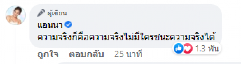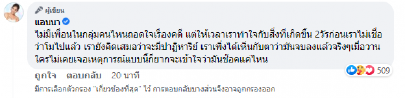 นอกจากนี้ยังคอมเมนต์ได้โพสต์ดังกล่าวอีกว่า ความจริงก็คือความจริงไม่มีใครชนะความจริงได้ และ ไม่มีเพื่อนในกลุ่มคนไหนถอดใจเรื่องคดี แต่ให้เวลาเราทำใจกับสิ่งที่เกิดขึ้น 2 วันก่อนเราไม่เชื่อว่าโมไปแล้ว เรายังคิดเสมอว่าจะมีปาฏิหาริย์ เราเพิ่งได้เห็นกับว่ามันจบลงแล้วจริง ๆ เมื่อวาน ใครไม่เคยเจอเหตุการณ์แบบนี้ก็ยากจะเข้าใจว่ามันอธิบายยากแค่ไหน