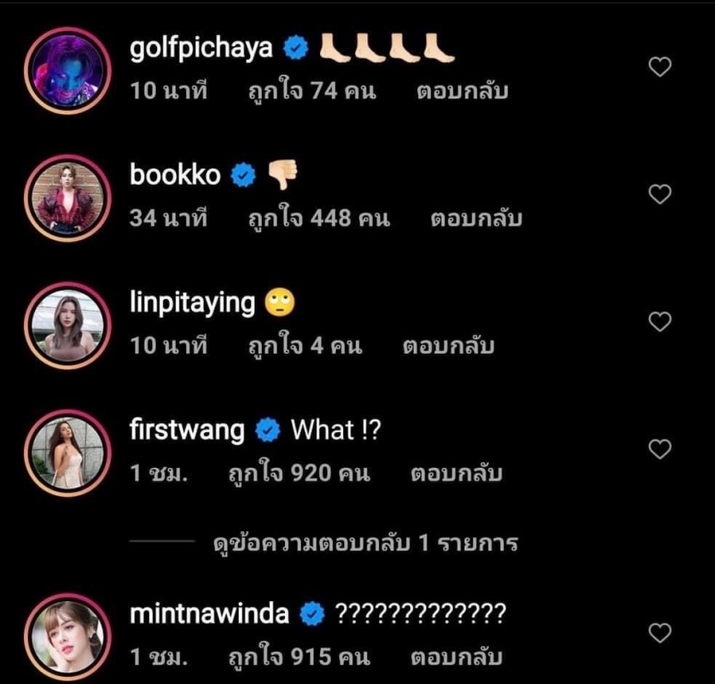 ด้านกอล์ฟ พิชยะ ก็ได้โพสต์อิโมจิ รูปเท้า, รวมไปถึงดีเจ บุ๊คโกะ ก็ได้คอมเมนต์ นิ้วมือ, ทางตัวแม่อย่าง ตู่ ปิยวดี ก็ออกมาคอมเมนต์ว่า ตรรกะไม่ไหวเลย ฯลฯ