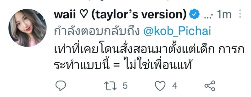 ทางด้านนักร้องสาว หวาย กามิกาเซ่ ก็ได้คอมเมนต์บ้างว่า เท่าที่เคยโดนสอนมาตั้งแต่เด็ก การกระทำแบบนี้ = ไม่ใช่เพื่อนแท้่ รวมไปถึงนักร้องสาวสวยอย่างแกรนด์ เดอะสตาร์ ก็ได้ทวิตสั้น ๆ แต่ได้ใจความว่า ปลอม