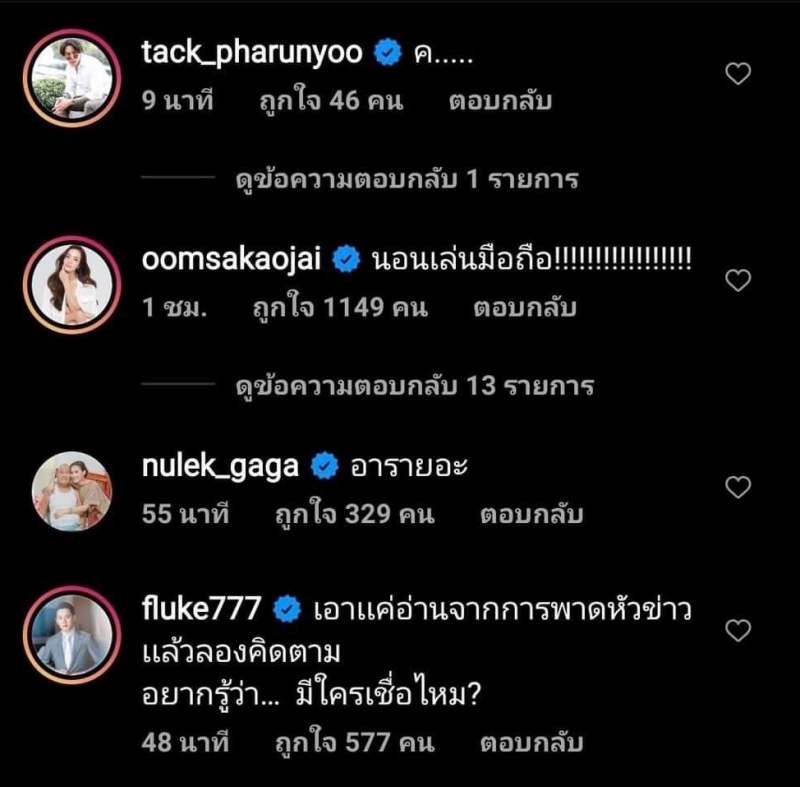 ทางด้านอินสตาแกรมก็ไม่ยอมแพ้กัน เมื่อเหล่าคนบันเทิง ต่างเข้ามาคอมเมนต์อย่างมากมาย อาทิเช่น อ๋อม สกาวใจ ได้คอมเมนต์ว่า นอนเล่นมือถือ, หนูเล็ก ก่อนบ่าย คอมเมนต์ว่า อารายอะ, ฟลุ๊ค เกริกพล ได้คอมเมนต์ว่า เอาแค่อ่านจากการพาดหัวข่าว แล้วลองคิดตาม อยากรู้ มีใครเชื่อมั้ย