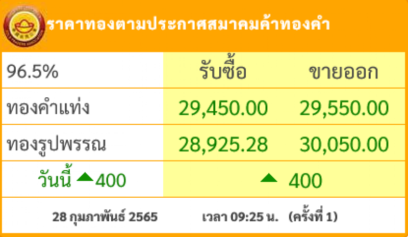 วันที่ 28 กุมภาพันธ์ 2565 สมาคมค้าทองคำรายงาน ราคาทองไทย ครั้งที่ 1 เมื่อเวลา 09:25 น. โดยราคาทองล่าสุดราคานั้น ได้มีการปรับพุ่งขึ้นมาอีก 400 บาท ในวันนี้ ส่งผลทำให้ราคาวันนี้ทองคำแท่ง รับซื้อบาทละ 29,450 ขายออกบาทละ 29,550 บาท ส่วนทองรูปพรรณ รับซื้อบาทละ 28,925.28 ขายออกบาทละ 30,050 บาท