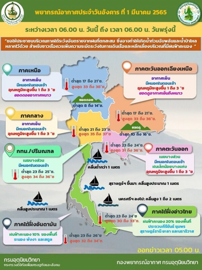 วันที่ 1 มี.ค.2565 กรมอุตุฯ พยากรณ์อากาศ 24 ชั่วโมงข้างหน้า บริเวณความกดอากาศสูงหรือมวลอากาศเย็นกำลังอ่อนปกคลุมประเทศไทยตอนบนและทะเลจีนใต้ ประกอบกับมีลมตะวันออกเฉียงใต้พัดนำความชื้นเข้ามาปกคลุมประเทศไทยตอนบน ทำให้บริเวณดังกล่าวมีอุณหภูมิสูงขึ้นกับมีหมอกในตอนเช้า โดยมีฝนบางแห่งในภาคตะวันออก