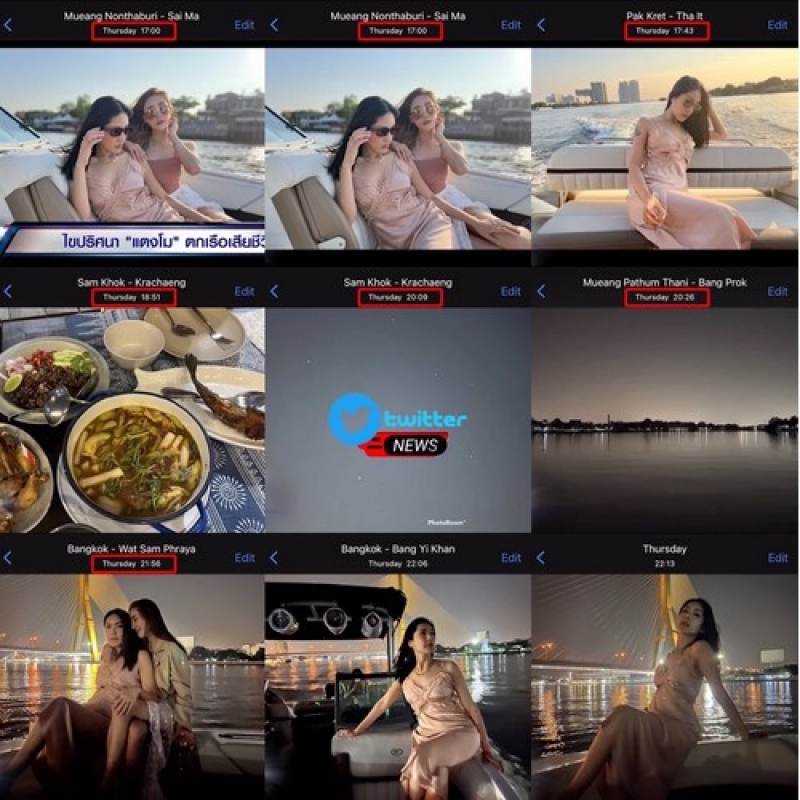 เเต่เมื่อสังเกตเวลาในมือถือไอโฟน ปรากฏภาพที่กระติกถ่ายรูปคู่กับเเตงโมในเวลา 21.56 น. พร้อมกับกระติกได้ยืนยัน ภาพสุดท้ายที่เเตงโมถ่ายให้กระติก ในเวลา 22.13 น. ซึ่งหากสังเกตจากเวลาในภาพเหล่านี้ ทำให้คิดเล่นๆกันได้ว่า น่าจะเป็นไปไม่ได้ที่ เเตงโม นิดา พลัดตกเรือไปตอน 22.00 น.ตามที่บอก