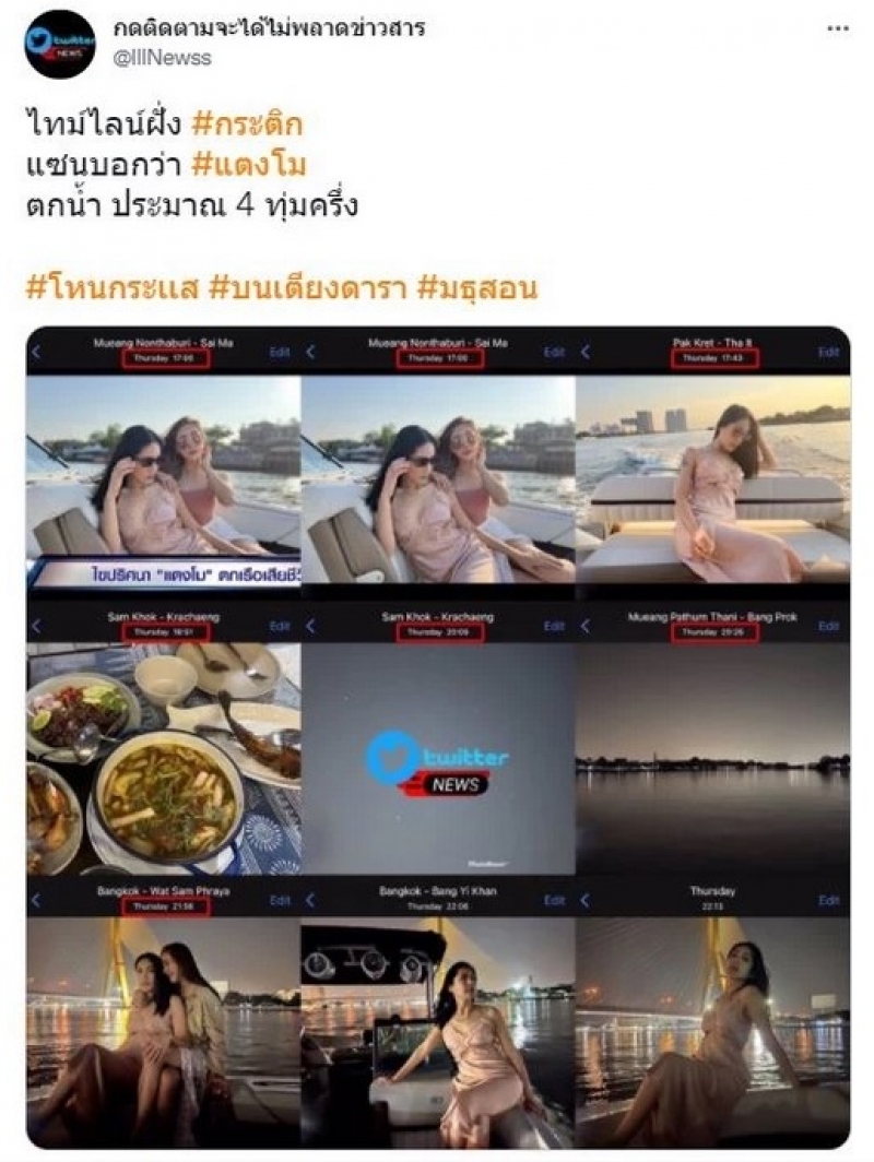 ซึ่งในช่วงหนึ่งของรายการโหนกระเเส ได้มีการเปิดภาพหลักฐานจากมือถือกระติก พร้อมกับ กระติก ได้เปิดเผยไทม์ไลน์การไปเที่ยวนั่งเรือในครั้งดังกล่าว ไล่เรียงตามช่วงเวลา ด้วยการโพสต์ภาพต่างๆหลายรูป พร้อมเวลาที่ระบุไว้ชัดเจน ซึ่ง แซน วิศาพัช ได้บอกว่า เเตงโม ตกน้ำไปตอนเวลา 4ทุ่ม (22.00น.)