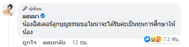 พร้อมเขียนข้อความว่า ต้องรอทางทิพยแจ้งค่ะว่าใครได้ผลประโยชน์ อย่างน้อยโมจะได้ไม่ต้องห่วงคนข้างหลัง และบอกอีกว่า น้องอีสเตอร์ลูกบุญธรรมของโมน่าจะได้รับค่ะ เป็นทุนการศึกษาให้น้อง