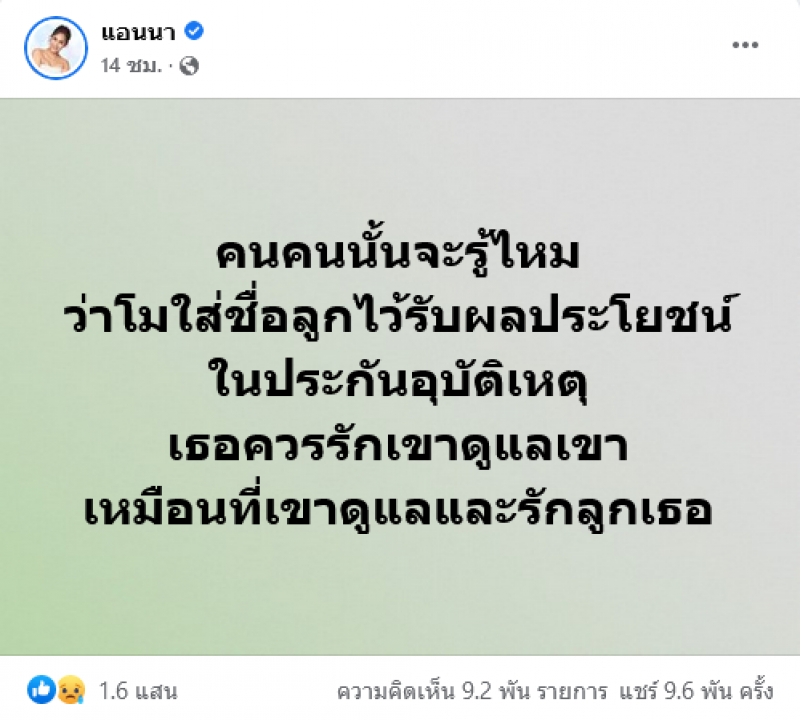 ทั้งนี้ ล่าสุดเมื่อวันที่ 1 มี.ค. ที่ผ่านมา เวลา 20.53 น. แอนนา โพสต์เฟซบุ๊กระบุว่า คนคนนั้นจะรู้ไหมว่า โมใส่ชื่อลูกไว้รับผลประโยชน์ เธอควรรักเขาดูแลเขา เหมือนที่เขาดูแลและรักลูกเธอ