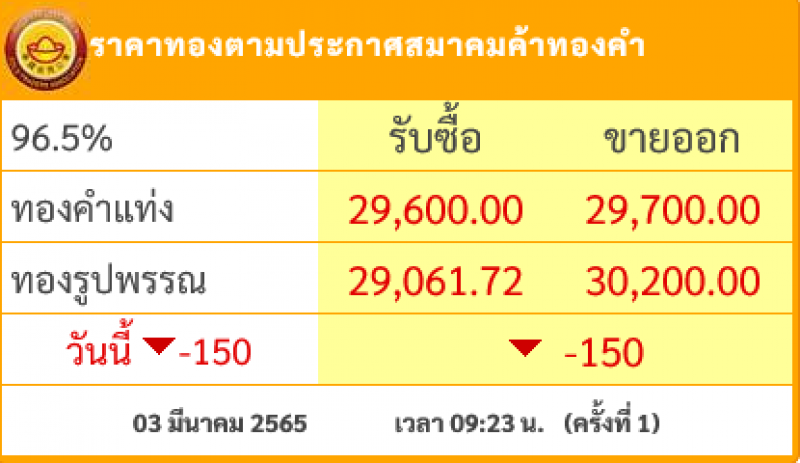 วันที่ 3 มีนาคม 2565 สมาคมค้าทองคำรายงาน ราคาทองไทย ครั้งที่ 1 เมื่อเวลา 09:23 น. โดยราคาทองล่าสุดราคานั้น ได้มีการปรับลดลงมา 150 บาท ในวันนี้ ส่งผลทำให้ราคาวันนี้ทองคำแท่ง รับซื้อบาทละ 29,600 ขายออกบาทละ 29,700 บาท ส่วนทองรูปพรรณ รับซื้อบาทละ 29,061.72 ขายออกบาทละ 30,200 บาท