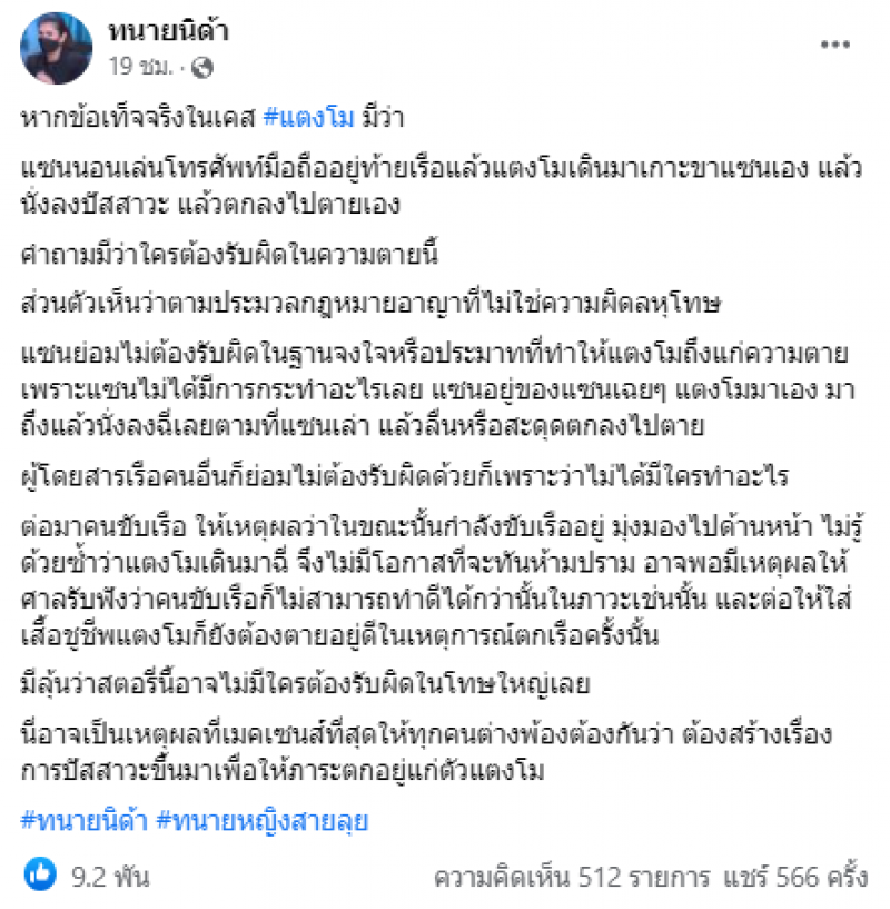 ส่วนตัวเห็นว่า ตามประมวลกฎหมายอาญาที่ไม่ใช่ความผิดลหุโทษ แซนย่อมไม่ต้องรับผิดในฐานจงใจหรือไม่ได้ตั้งใจ ที่ทำให้แตงโมต้องเป็นแบบนี้ เพราะแซนไม่ได้มีการกระทำอะไรเลย แซนอยู่ของแซนเฉย ๆ แตงโมมาเอง มาถึงแล้วนั่งลงฉี่เลยตามที่แซนเล่า แล้วลื่นหรืออะไรก็ตามตกลงไป ผู้โดยสารเรือคนอื่นก็ย่อมไม่ต้องรับผิดด้วยก็เพราะว่าไม่ได้มีใครทำอะไร