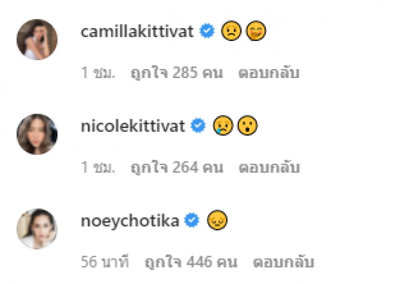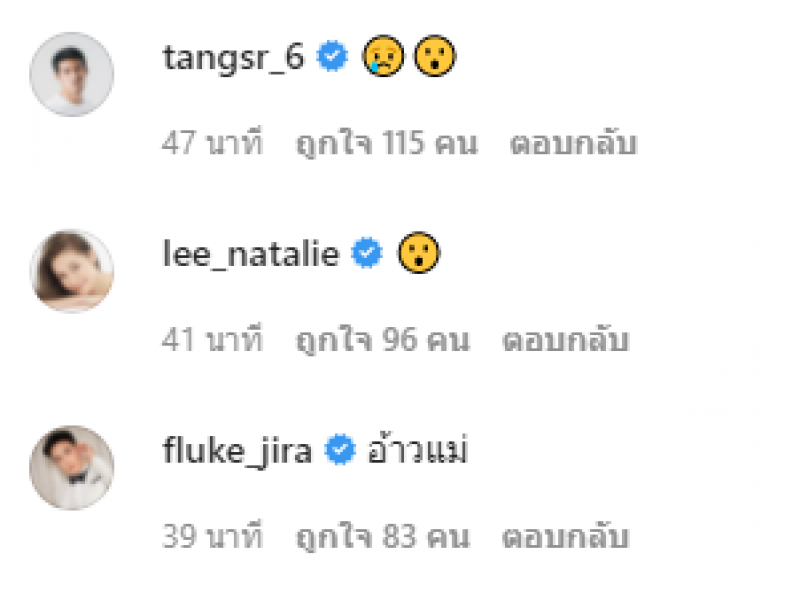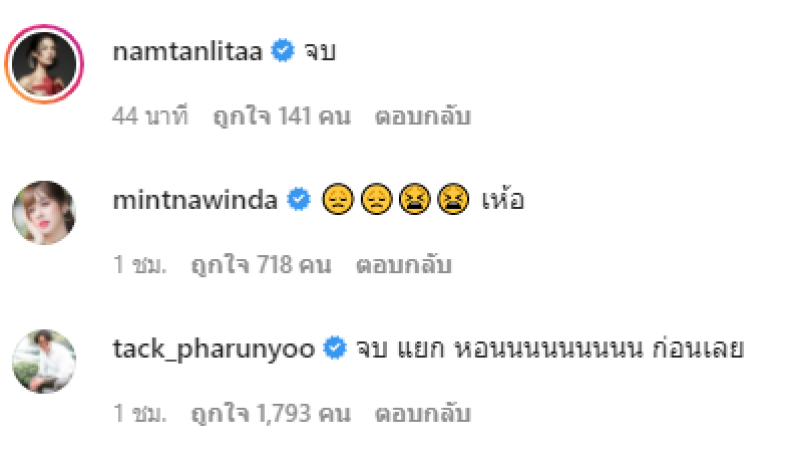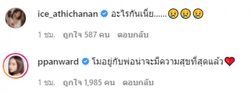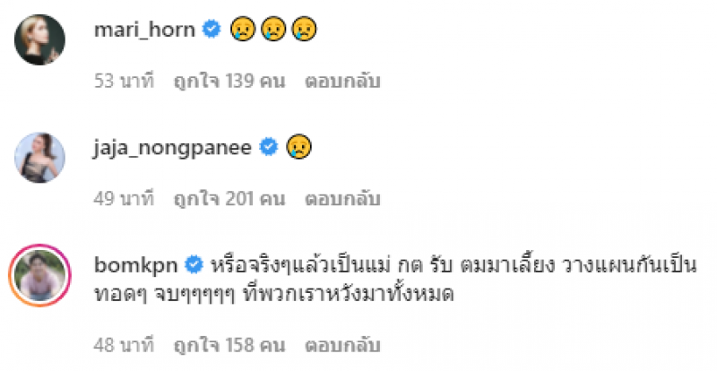 น้ำตาล ชลิตา ได้คอมเมนต์ว่า จบ, มิ้นท์ นวินดา คอมเมนต์ว่า เห้อ, เป้ย ปานวาดได้คอมเมนต์ว่า โมอยู่กับพ่อน่าจะมีความสุขที่สุดแล้ว, บอม KPN ได้คอมเมนต์ว่า หรือจริง ๆ แล้วเป็นแม่ กต รับ ตม มาเลี้ยง วางแผนกัน จบ ๆ ที่พวกเราหวังมาทั้งหมด ฯลฯ