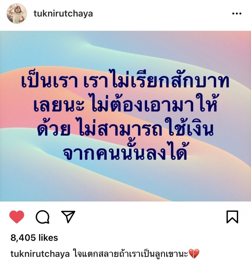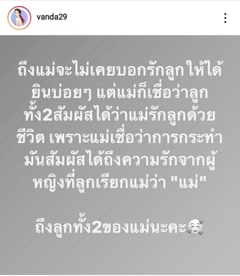เช่นเดียวกันกับแม่โบว์ แวนด้า ก็ได้โพสต์ในไอจีว่า ถึงแม่จะไม่เคยบอกรักลูกให้ได้ยินบ่อย ๆ แต่แม่ก็เชื่อว่าลูกทั้ง 2 สัมผัส ได้ว่าแม่รักลูกด้วยชีวิต เพราะแม่เชื่อว่าการกระทำมันสัมผัสได้ถึงความรักจากผู้หญิงที่ลูกเรียกแม่ว่า แม่