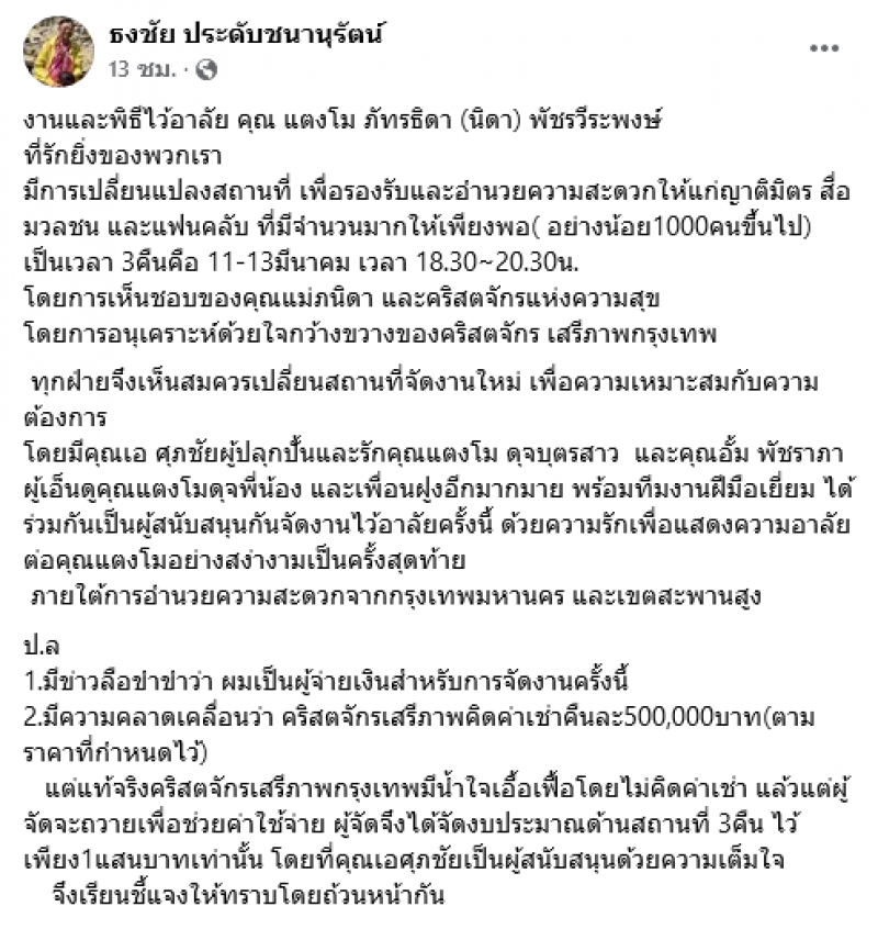 วันที่ 6 มีนาคม 2565 มีรายงานว่า อ.ธงชัย ได้มีการออกมาชี้แจง ถึงประเด็นข่าวที่ว่า มีการเรียกเก็บค่าเช่าสถานที่ ไว้อาลัย ดาราสาว แตงโม นิดา คืนละ 5 แสนบาท เป็นความคลาดเคลื่อน ซึ่งไม่เป็นเป็นความจริง โดยได้ชี้แจงในโพสต์เฟซบุ๊ก ธงชัย ประดับชนานุรัตน์