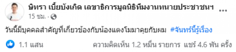 แต่เมื่อกลางดึกคืนที่ผ่านมา ทนายตั้ม ได้ทำการโพสต์เฟซบุ๊ก ษิทรา เบี้ยบังเกิด เลขาธิการมูลนิธิ ทีมงานทนายประชาชนฯ ระบุสั้น ๆ แต่ได้ใจความว่า วันนี้มีบุคคลสำคัญที่เกี่ยวข้องกับน้องแตงโมมาคุยกับผม #จันทร์นี้รู้เรื่อง