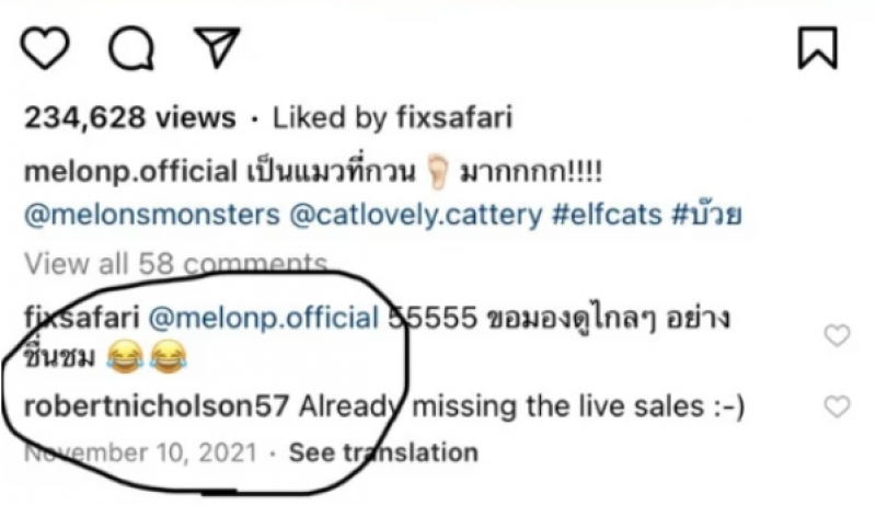 เป็นข้อความว่า Already missing the live sales แต่ปรากฏว่า เมื่อเข้าไปตรวจสอบดูที่รูปดังกล่าวของ แตงโม นิดา กลับไม่พบคอมเมนต์ดังกล่าวแล้ว ในขณะเดียวกันก็ยังมีชาวโซเชียลบางรายบอกอีกว่าความจริงแล้ว โรเบิร์ต แอบชอบ แตงโม นิดา มาตั้งนานแล้วด้วย