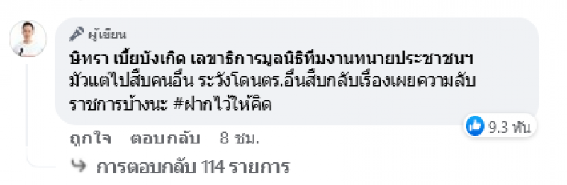 ล่าสุดเมื่อคืนนี้ ทางด้านทนายตั้ม ก็ได้มีการโพสต์ในเพจ ษิทรา เบี้ยบังเกิด เลขาธิการมูลนิธิทีมงานทนายประชาชนฯ ระบุว่า มีข้อมูลวงในว่า พลตำรวจตรี น. ขายข้อมูลความลับการสืบสวนคดีน้องแตงโมให้กับบุคคลภายนอก ฝากผบ.ตร.ตรวจสอบด้วยนะครับ จากข้อความดังกล่าว ก็ได้กลายเป็นประเด็น ทีี่ถูกวิพากษ์วิจารณ์อยู่ในขณะนี้