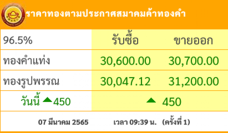 วันที่ 7 มีนาคม 2565 สมาคมผู้ค้าทองคำรายงาน ราคาทองไทย ครั้งที่ 1 เมื่อเวลา 09:39 น. โดยราคาทองล่าสุดราคานั้น ได้มีการปรับขึ้นมาในช่วงเช้า 450 บาท ในวันนี้ ส่งผลทำให้ราคาวันนี้ทองคำแท่ง รับซื้อบาทละ 30,600 ขายออกบาทละ 30,700บาท ส่วนทองรูปพรรณ รับซื้อบาทละ 30,047.12 ขายออกบาทละ 31,200 บาท