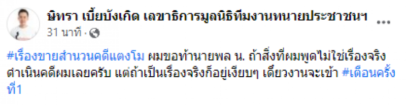 ด้านนายษิทรา เบี้ยบังเกิด หรือ ทนายตั้ม ได้ออกมาโพสต์ผ่านเฟซบุ๊ค ษิทรา เบี้ยบังเกิด เลขาธิการมูลนิธิทีมงานทนายประชาชนฯ มีข้อความสั้น ๆ แต่ทิ้งปริศนาไว้เยอะมากว่า #เรื่องขายสำนวนคดีแตงโม ผมขอท้านายพล น. ถ้าสิ่งที่ผมพูดไม่ใช่เรื่องจริง ดำเนินคดีผมเลยครับ แต่ถ้าเป็นเรื่องจริงก็อยู่เงียบ ๆ เดี๋ยวงานจะเข้า #เตือนครั้งที่1