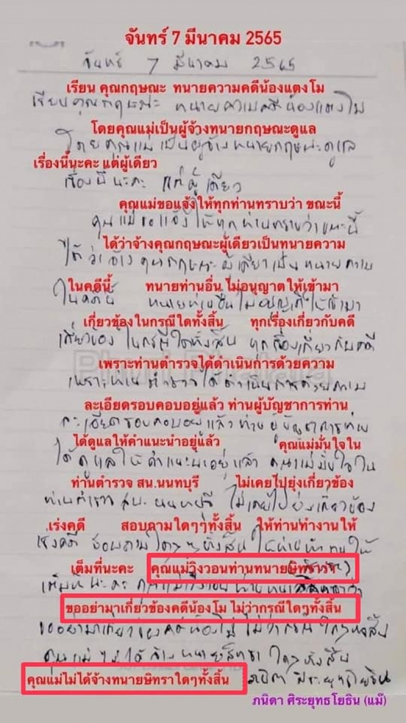 ล่าสุด กลับมีประเด็นดราม่าเกิดขึ้นกับคุณแม่ของแตงโม หลังจากที่ไปออกรายการโหนกระแส ต่อมาเรื่อย ๆ จนในวันนี้คุณแม่ได้มีการเขียนจดหมายถึงทนายตั้ม ถึงกรณีที่ทนายตั้มเข้ามายุ่งเรื่องคดีของแตงโม นิดา