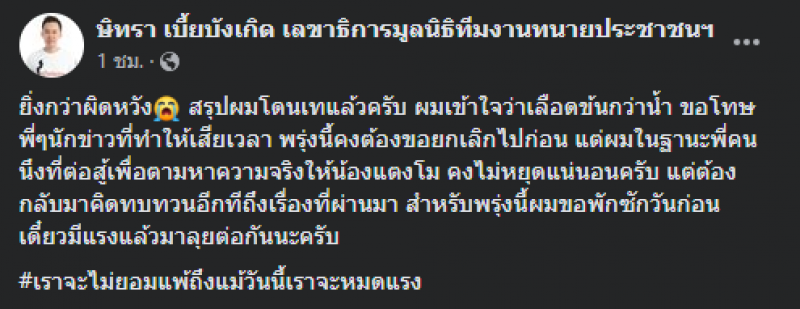 แต่ผมในฐานะพี่คนนึงที่คอยติดตาม เพื่อตามหาความจริงให้น้องแตงโม คงไม่หยุดแน่นอนครับ แต่ต้องกลับมาคิดทบทวนอีกทีถึงเรื่องที่ผ่านมา สำหรับพรุ่งนี้ผมขอพักซักวันก่อน เดี๋ยวมีแรงแล้วมาลุยต่อกันนะครับ #เราจะไม่ยอมแพ้ถึงแม้วันนี้เราจะหมดแรง