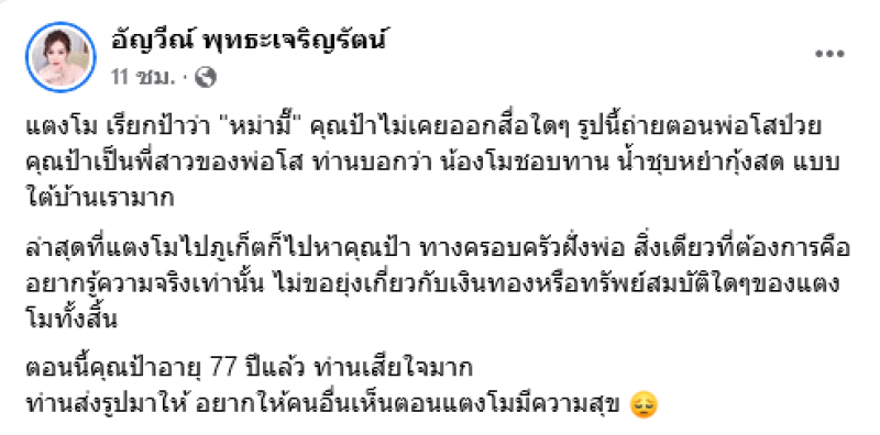 ผู้สื่อข่าวรายงานว่า ในเฟซบุ๊ก อัญวีณ์ พุทธะเจริญรัตน์ ได้มีการโพสต์ภาพ แตงโม ภัทรธิดา หรือ แตงโม นิดา กับ คุณป้าแท้สุดรัก พร้อมข้อความว่า