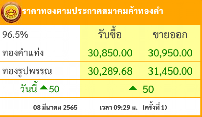 วันที่ 8 มีนาคม 2565 สมาคมผู้ค้าทองคำรายงาน ราคาทองไทย ครั้งที่ 1 เมื่อเวลา 09:29 น. โดยราคาทองล่าสุดราคานั้น ได้มีการปรับขึ้นมาในช่วงเช้าอีก 50 บาท ในวันนี้ ส่งผลทำให้ราคาวันนี้ทองคำแท่ง รับซื้อบาทละ 30,850 ขายออกบาทละ 30,950 บาท ส่วนทองรูปพรรณ รับซื้อบาทละ 30,289.68 ขายออกบาทละ 31,450 บาท