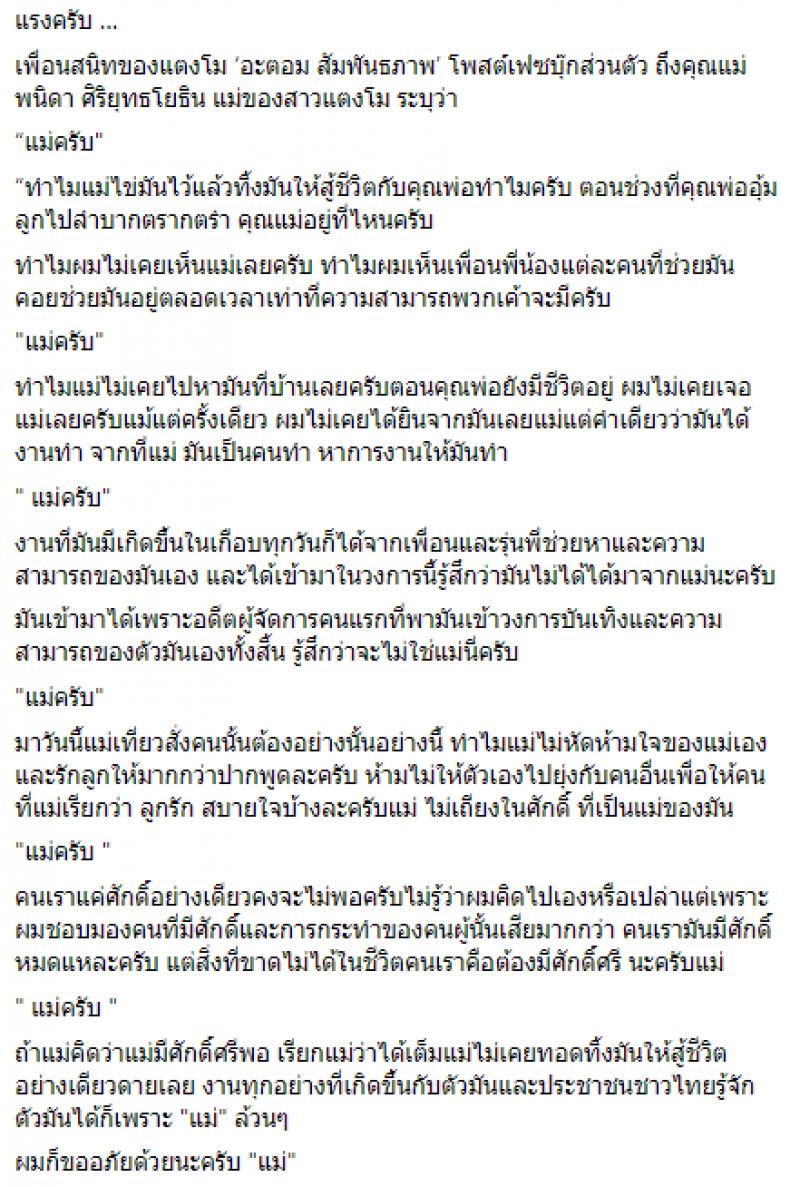 แม่ครับ ทำไมแม่ไม่เคยไปหามันที่บ้านเลยครับ ตอนคุณพ่อยังมีชีวิตอยู่ ผมไม่เคยเจอแม่เลยครับ แม้แต่ครั้งเดียว ผมไม่เคยได้ยิน จากมันเลยแม้แต่คำเดียวว่ามันได้งานทำ จากที่แม่มันเป็นคน หาการหางานให้มันทำ แม่ครับ งานที่มันมีเกิดขึ้นในเกือบทุกวันก็ได้จากเพื่อนและรุ่นพี่ช่วยหาและความสามารถของมันเอง และได้เข้ามาในวงการนี้รู้สึกว่า มันไม่ได้มาจากแม่น่ะครับ มันเข้ามาได้เพราะอดีตผู้จัดการคนแรกที่พามันเข้าวงการบันเทิงและความสามารถของตัวมันเอง รู้สึกว่าจะไม่ใช่แม่นี่ครับ