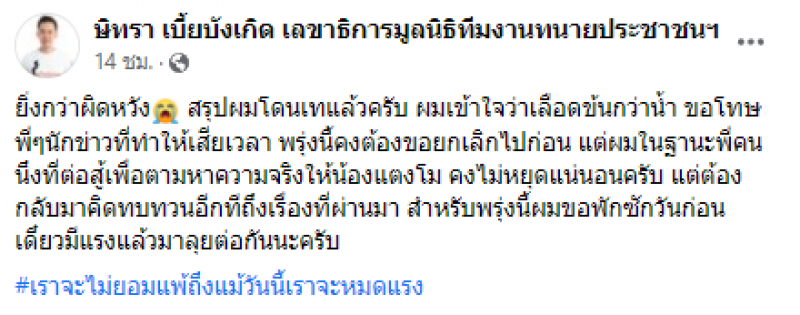 แต่ผมในฐานะพี่คนนึงที่ไฟต์เพื่อตามหาความจริงให้น้องแตงโม คงไม่หยุดแน่นอนครับ แต่ต้องกลับมาคิดทบทวนอีกที ถึงเรื่องที่ผ่านมา สำหรับพรุ่งนี้ผมขอพักซักวันก่อน เดี๋ยวมีแรงแล้วมาลุยต่อกันนะครับ #เราจะไม่ยอมแพ้ ถึงแม้วันนี้เราจะหมดแรง
