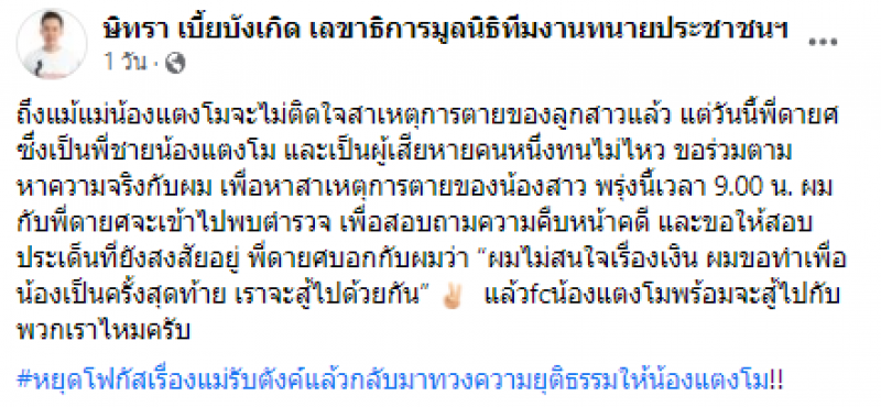 พรุ่งนี้ (8 ก.พ. 2565) เวลา 9.00 น. ผมกับพี่ดายศจะเข้าไปพบตำรวจ เพื่อสอบถามความคืบหน้าคดี และขอให้สอบประเด็นที่ยังสงสัยอยู่ พี่ดายศบอกกับผมว่า ผมไม่สนใจเรื่องเงิน ผมขอทำเพื่อน้องเป็นครั้งสุดท้าย เราจะไฟต์ไปด้วยกัน แล้ว fc น้องแตงโมพร้อมจะไฟต์ไปกับพวกเราไหมครับ #หยุดโฟกัสเรื่องแม่รับตังค์แล้วกลับมาทวงความยุติธรรมให้น้องแตงโม!!