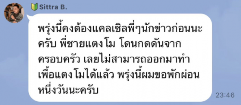 ล่าสุด ในสังคมออนไลน์ได้มีการแชร์ข้อความทางไลน์จาก ทนายตั้ม เผยสาเหตุ ที่พี่ชายแตงโม ถอนตัว หลังเปิดตัวไม่ทันข้ามวัน โดยทางด้าน ทนายตั้ม ได้ส่งข้อความตอนเวลา 23.46 น. ว่า พรุ่งนี้คงต้องแคนเซิลพี่ ๆ นักข่าวก่อนนะครับ พี่ชายแตงโม โดนต่อว่าจากครอบครัว เลยไม่สามารถออกมาทำเพื่อแตงโมได้แล้ว พรุ่งนี้ผมขอพักผ่อนหนึ่งวันนะครั้ง