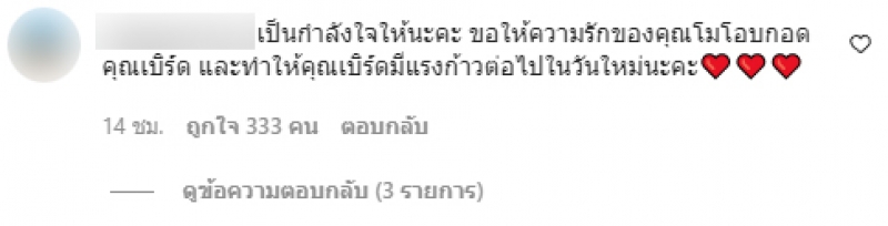 ทั้งนี้ยังมี แฟนคลับชาวไทยและชาวต่างชาติเข้ามาคอมเมนต์กันอย่างต่อเนื่อง เพื่อส่งกำลังใจให้หนุ่มเบิร์ด อาทิ เป็นกำลังใจให้นะคะ ขอให้ความรักของคุณโมโอบกอดคุณเบิร์ด และทำให้คุณเบิร์ดมีแรง ก้าวต่อไปในวันใหม่นะคะ , น่ารักอีกแล้วค่ะ เป็นต้น