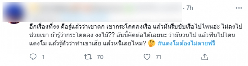 แล้วมันรีบขับเรือไปไหนอ่ะ ไม่ลงไปช่วยเขา ถ้ารู้ว่ากระโดดลง งงไหม?? อันนี้คิดต่อได้เลยนะ ว่ามันวนไป แล้วฟินไปโดนแตงโม แล้วรู้ตัวว่าทำเขาจนถึงแก่ชีวิต แล้วหนีเลยไหม? ในขณะที่ชาวโซเชียลคนอื่น เข้ามาคอมเมนต์วิจารณ์เหตุการณ์ดังกล่าวที่เกิดขึ้น