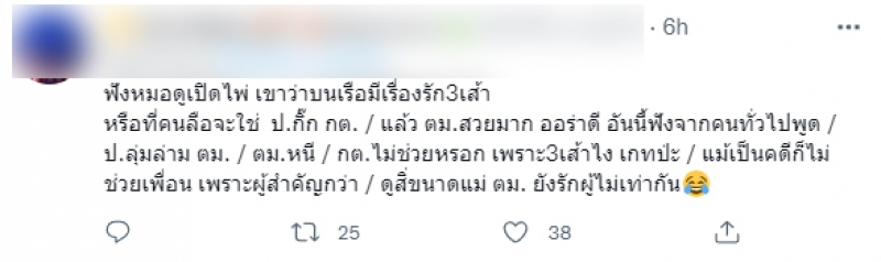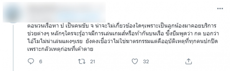 ล่าสุด ในสังคมทวิตเตอร์ มีชาวโซเชียลรายหนึ่ง ได้โพสต์คลิปบนเรือ ที่มีบทสนทนาของผู้ชายพูดว่า พี่ปอช้าลงหน่อย ๆ และ ไม่น่าให้มันกระโดดลงไปเลย ซึ่งคนที่แชร์คลิปนี้ ได้แสดงความเห็นใต้คลิปของตัวเองว่า อีกเรื่องที่ งง คือ รู้แล้วว่าเขาตก เขากระโดดลงเรือ
