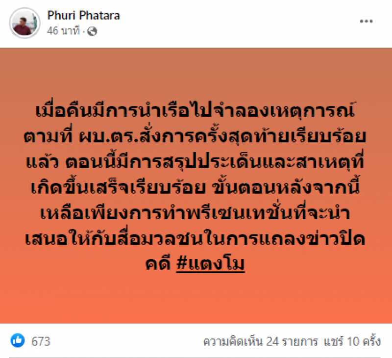 ตอนนี้มีการสรุปประเด็นและสาเหตุที่เกิดขึ้ันเสร็จเรียบร้อย ขั้นตอนหลังจากนี้เหลือเพียงการนำพรีเซนเทชั่นที่จะนำเสนอ ให้กับสื่อในการแถลงข่าวปิดคดี #แตงโม หลังจากข้อความดังกล่าวได้ถูกเผยแพร่ออกไปแล้วนั้น ได้มีชาวโซเชียลจำนวนมาก สงสัยถึงการทำคดีในครั้งนี้ว่า รีบสรุปคดีเร็วไปหรือไม่ เพราะนี่เป็นคดีดัง และคนทั้งประเทศให้ความสนใจ