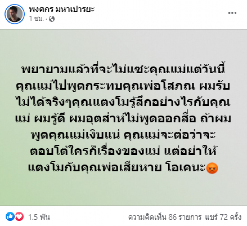 รวมถึงภาพข้อความที่เขียนไว้ว่าพยายามแล้วที่จะไม่ยุ่งกับคุณแม่ แต่รับไม่ได้ที่แม่พูดกระทบพ่อโสภณ แตงโมรู้สึกอย่างไรกับคุณแม่ ผมรู้ดี ผมอุตส่าห์ไม่พูดออกสื่อ ถ้าผมพูดคุณแม่เงิบแน่ ตามข้อความนี้ว่า