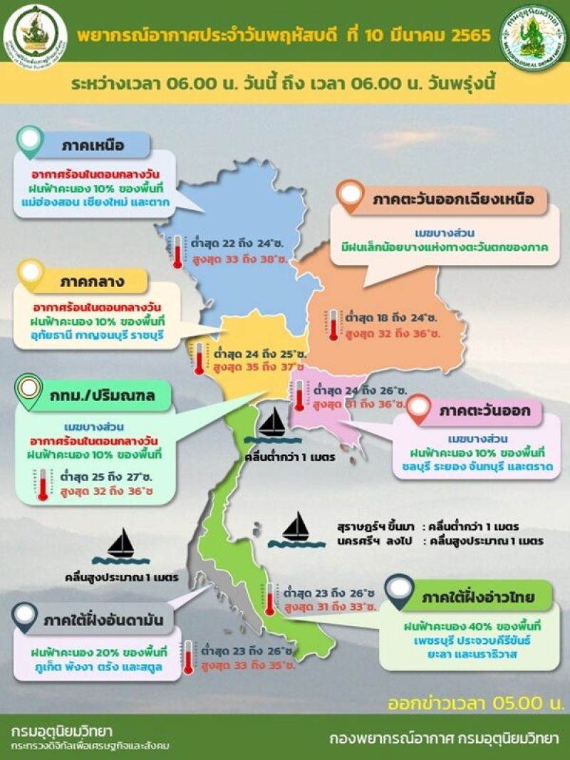เมื่อวันที่ 10 มี.ค.2565 กรมอุตุฯ พยากรณ์อากาศ 24 ชั่วโมงข้างหน้า หย่อมความกดอากาศต่ำเนื่องจากความร้อนปกคลุมประเทศไทยตอนบน ประกอบกับลมใต้และลมตะวันออกเฉียงใต้ที่พัดปกคลุมอ่าวไทยและประเทศไทยตอนบนมีกำลังอ่อน