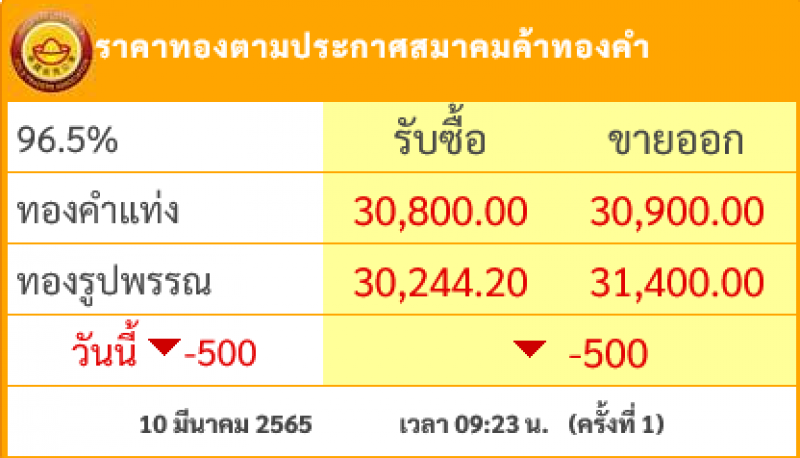 วันที่ 10 มีนาคม 2565 สมาคมค้าทองคำรายงาน ราคาทองไทย ครั้งที่ 1 เมื่อเวลา 09:23 น. โดยราคาทองล่าสุดราคานั้น ได้มีการปรับลดลงมา 500 บาท ในวันนี้ ส่งผลทำให้ราคาวันนี้ทองคำแท่ง รับซื้อบาทละ 30,800 ขายออกบาทละ 30,900 บาท ส่วนทองรูปพรรณ รับซื้อบาทละ 30,244.20 ขายออกบาทละ 31,400 บาท
