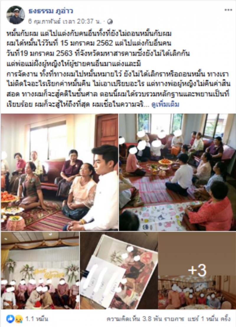 โดยผู้ใช้เฟซบุ๊กที่ใช้ชื่อว่า ธงธรรม ภูอ่าว ได้โพสต์เรื่องราวระบุว่า หมั้นกับผม แต่ไปแต่งกับคนอื่นทั้งที่ยังไม่ถอนหมั้นกับผม ผมได้หมั้นไว้วันที่ 15 มกราคม 2562 แต่ไปแต่งกับอื่นคน วันที่19 มกราคม 2563 ที่จังหวัดมหาสารคามซึ่งยังไม่ได้เลิกกัน แต่พ่อแม่ฝั่งผู้หญิงให้ผู้ชายคนอื่นมาแต่งและมี การจัดงาน ทั้งที่ทางผมไปหมั้นหมายไว้ ยังไม่ได้เลิกราหรือถอนหมั้น ทางเราไม่ติดใจอะไรเรียกค่าหมั้นคืน ไม่เอาเปรียบอะไร แต่ทางพ่อผู้หญิงไม่คืนค่าสินสอด ทางผมก็จะสู้คดีในชั้นศาล ตอนนี้ผมได้รวบรวมหลักฐานและพยานเป็นที่เรียบร้อย ผมก็จะสู้ให้ถึงที่สุด ผมเชื่อในความจริงและความเป็นธรรมของศาลในการสู้ครั้งนี้ เนื่องจากพ่อผู้หญิงให้ไปฟ้องเอา