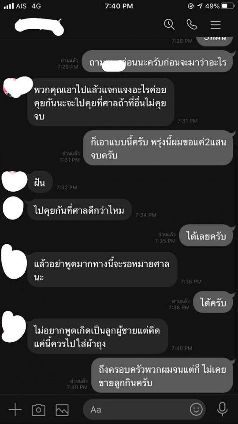 นอกจากนี้เจ้าของเรื่องยังเผยแพร่แชทซึ่งคาดว่าจะเป็นพ่อของฝ่ายสาวซึ่งมีการปัดความผิดชอบเพื่อที่จะให้ไปฟ้องศาลเอาอย่างเดียว