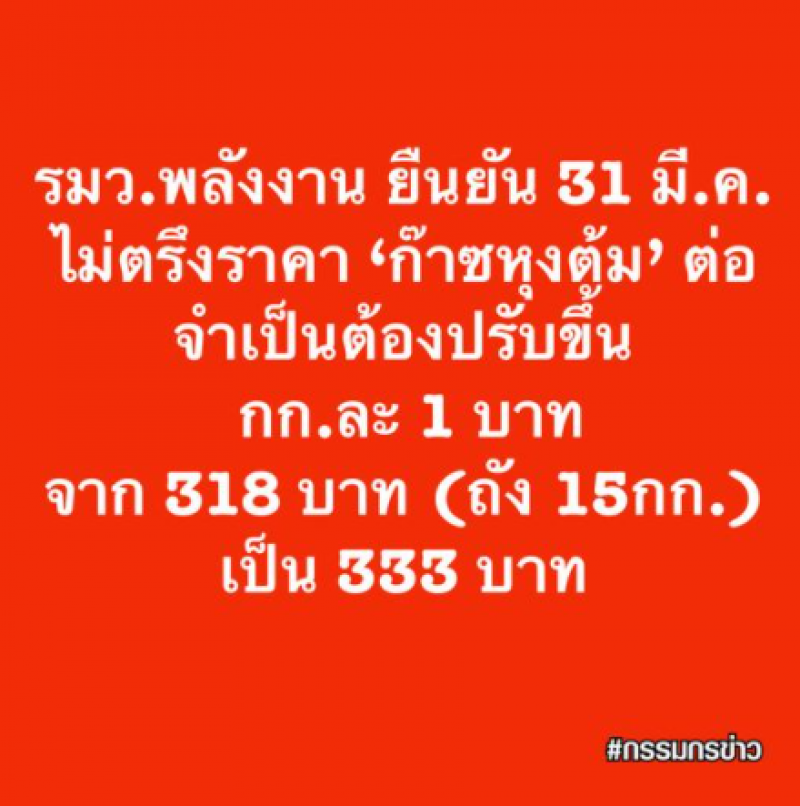 นายสุพัฒนพงษ์ พันธ์มีเชาว์ รองนายกรัฐมนตรี และรัฐมนตรีว่าการกระทรวงพลังงาน ยืนยันว่า 31 มี.ค. 2565 นี้ ไม่ตรึงราคาก๊าซหุงต้มต่อ จำเป็นต้องปรับขึ้น กก.ละ 1 บาท จาก 318 บาท (ถัง 15 กก.) เป็น 333 บาท ระบุต้องทำอย่างรอบคอบ