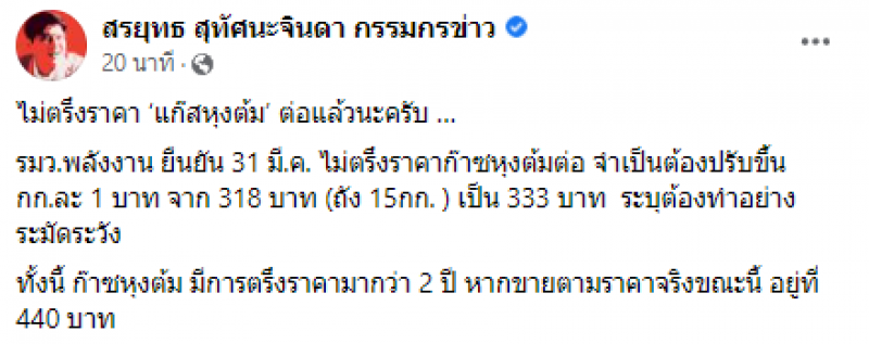 ล่าสุด มีอีกหนึ่งสิ่งที่ขึ้นราคา นั่นก็คือก๊าซหุงต้ม โดยเรื่องนี้มีที่มาจาก เพจเฟซบุ๊ก สรยุทธ สุทัศนะจินดา กรรมกรข่าว ได้ทำการโพสต์ข้อความว่า ไม่ตรึงราคา แก๊สหุงต้ม ต่อแล้วนะครับ
