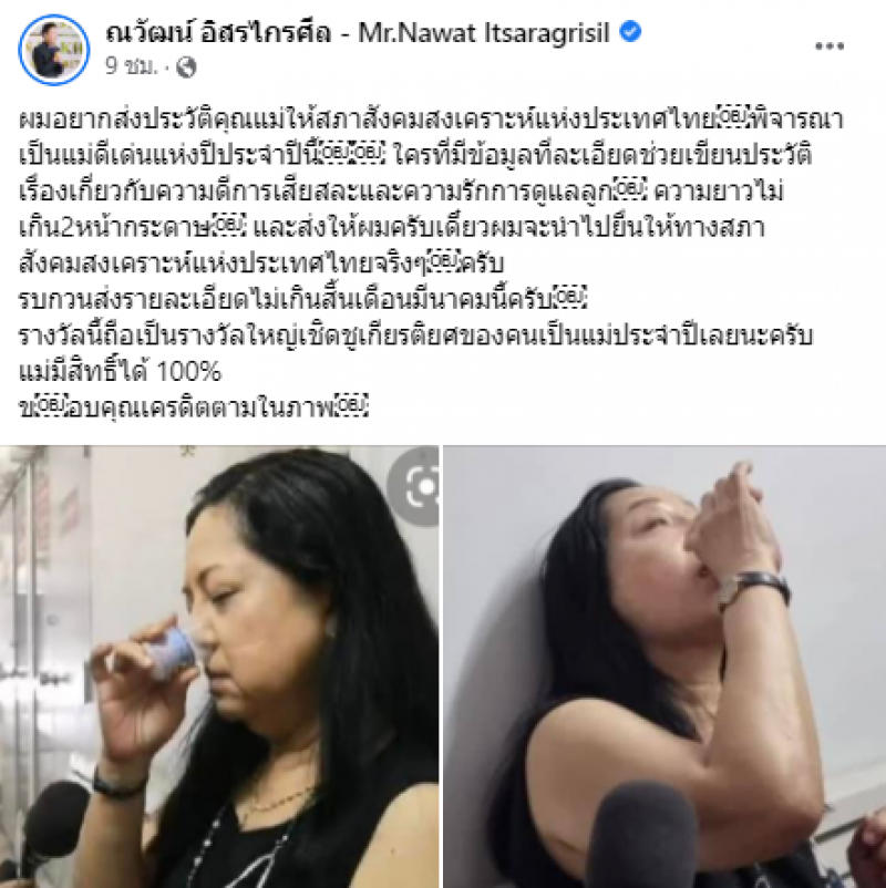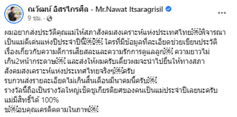 ใครที่มีข้อมูลที่ครบถ้วน ช่วยเขียนประวัติ เรื่องเกี่ยวกับความดี การอุทิศตน และความรักการดูแลลูก ความยาวไม่เกิน 2 หน้ากระดาษ และส่งให้ผมครับ เดี๋ยวผมจะนำไปยื่นให้ทางสภาสังคมสงเคราะห์แห่งประเทศไทยจริง ๆ ครับ ช่วยส่งรายละเอียด ไม่เกินสิ้นเดือนมีนาคมนี้ครับ รางวัลนี้ถือเป็นรางวัลใหญ่เชิดชูเกียรติยศของคนเป็นแม่ประจำปีเลยนะครับ แม่มีสิทธิ์ได้ 100%