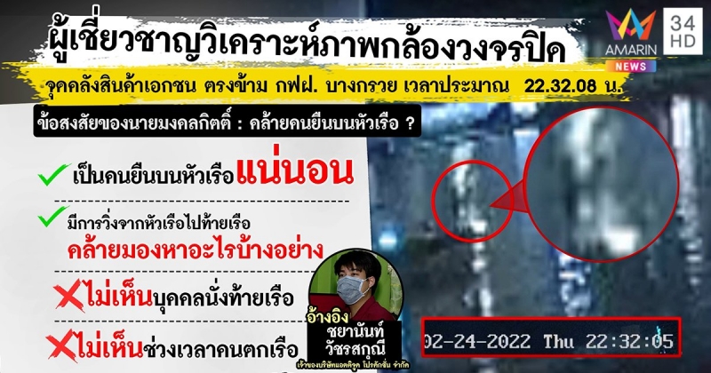 หลังจากช่วงที่ค้าง คนบนเรือมีการเปลี่ยนอิริยาบถ ก่อนหน้านี้เหมือนตนเองเห็นลักษณะคล้ายคนยืนอยู่บริเวณหัวเรือ ไม่แน่ใจกี่คน แต่คนบนเรือน่าจะรู้แล้วว่ามีคนตก จึงวิ่งไปท้ายเรือ และวิ่งมาหน้าเรือ ส่วนสาเหตุที่ภาพหายไปเกือบ 1 วินาทีนั้น คาดว่าถูกตัดต่อ หรือเป็นช่วงเปลี่ยนเทปของกล้องวงจรปิดพอดี