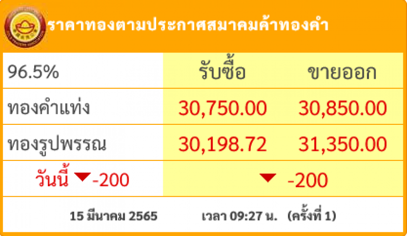 วันที่ 15 มีนาคม 2565 สมาคมค้าทองคำรายงาน ราคาทองไทย ครั้งที่ 1 เมื่อเวลา 09:27 น. โดยราคาทองล่าสุดราคานั้น ได้มีการปรับลดลงมา 200 บาท ในวันนี้ ส่งผลทำให้ราคาวันนี้ทองคำแท่ง รับซื้อบาทละ 30,750 ขายออกบาทละ 30,850 บาท ส่วนทองรูปพรรณ รับซื้อบาทละ 30,198.72 ขายออกบาทละ 31,350 บาท