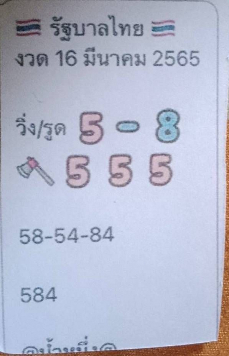 โดยในวันที่ 16/3/65 นี้ แม่น้ำหนึ่งได้ให้แนวทางเน้นไปที่เลข 5-8 เน้นเลข 5 เลข 2 ตัวได้แก่ 58-54-84 ขณะที่เลข 3 ตัว แม่น้ำหนึ่งเน้นไปที่เลข 584